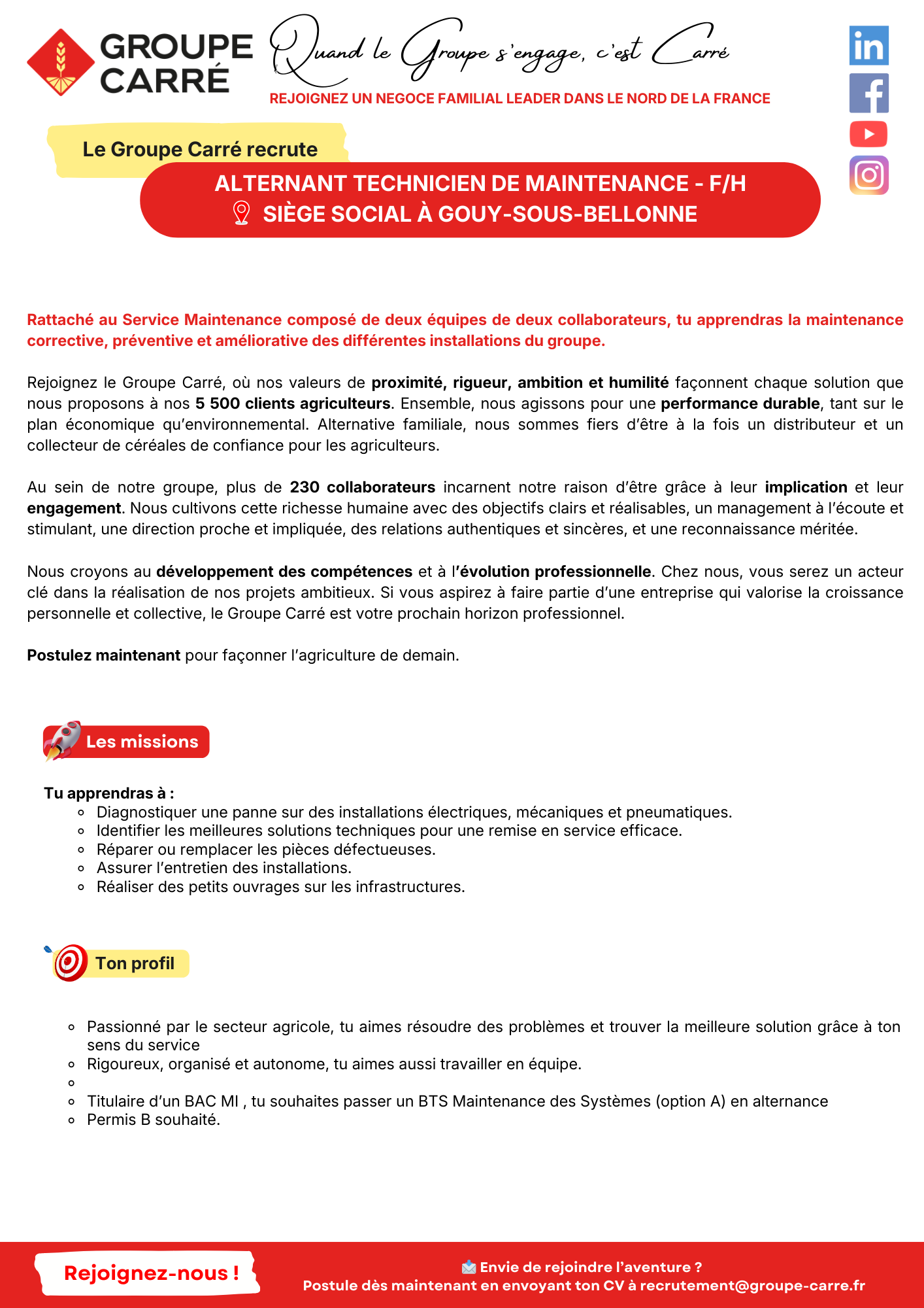 Alternant technicien maintenance à Gouy-sous-Bellonne – F/H en alternancemathieu.tasiemski5 janvier 2026Groupe Carré Rattaché au Service Maintenance composé de deux équipes de deux collaborateurs, tu apprendras la maintenance corrective, préventive et améliorative des différentes installations du groupe. Votre nom Votre prénom Votre e-mail Intitulé du poste : Votre message : Votre CV : Votre Lettre de Motivation Veuillez laisser ce champ vide. Δ