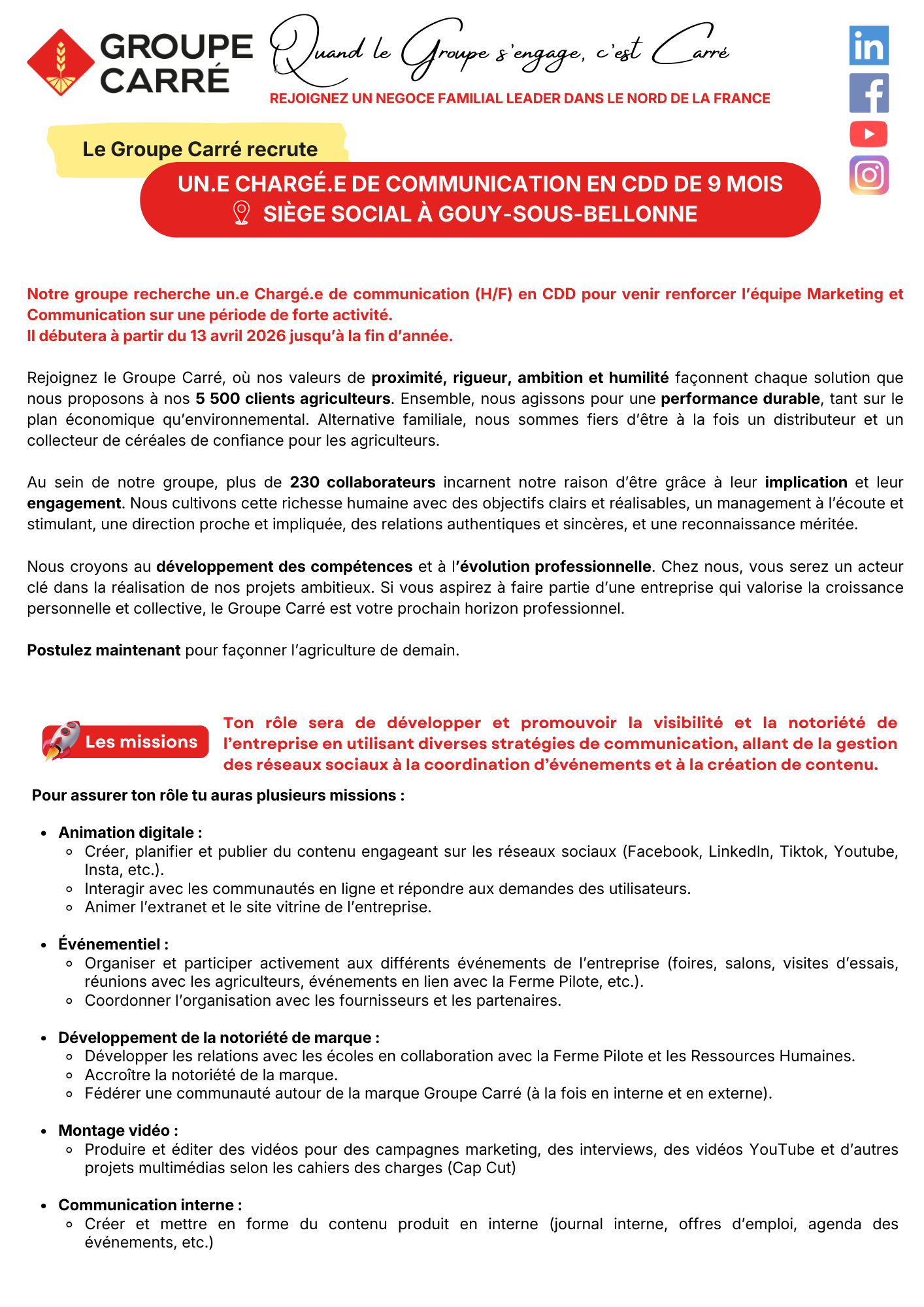 Chargé.e de communication – F/H – CDD 9 moisthomas.delefortrie6 février 2026Non classé Notre groupe recherche un.e Chargé.e de communication (H/F) en CDD pour venir renforcer l’équipe Marketing et Communication sur une période de forte activité. Il débutera à partir du 13 avril 2026 jusqu’à la fin d’année. Votre nom Votre prénom Votre e-mail Intitulé du poste : Votre message : Votre CV : Votre Lettre de Motivation Veuillez laisser ce champ vide. Δ