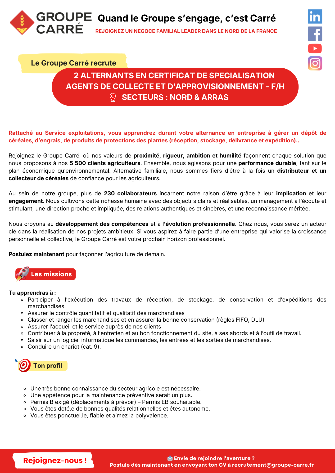 2 Alternants en certificat de spécialisation agents de collecte et d’approvisionnement – F/H – Secteurs : Nord & Artoisthomas.delefortrie17 mars 2026Non classé Rattaché au Service exploitations, vous apprendrez durant votre alternance en entreprise à gérer un dépôt de céréales, d’engrais, de produits de protections des plantes (réception, stockage, délivrance et expédition).. Votre nom Votre prénom Votre e-mail Intitulé du poste : Votre message : Votre CV : Votre Lettre de Motivation Veuillez laisser ce champ vide. Δ