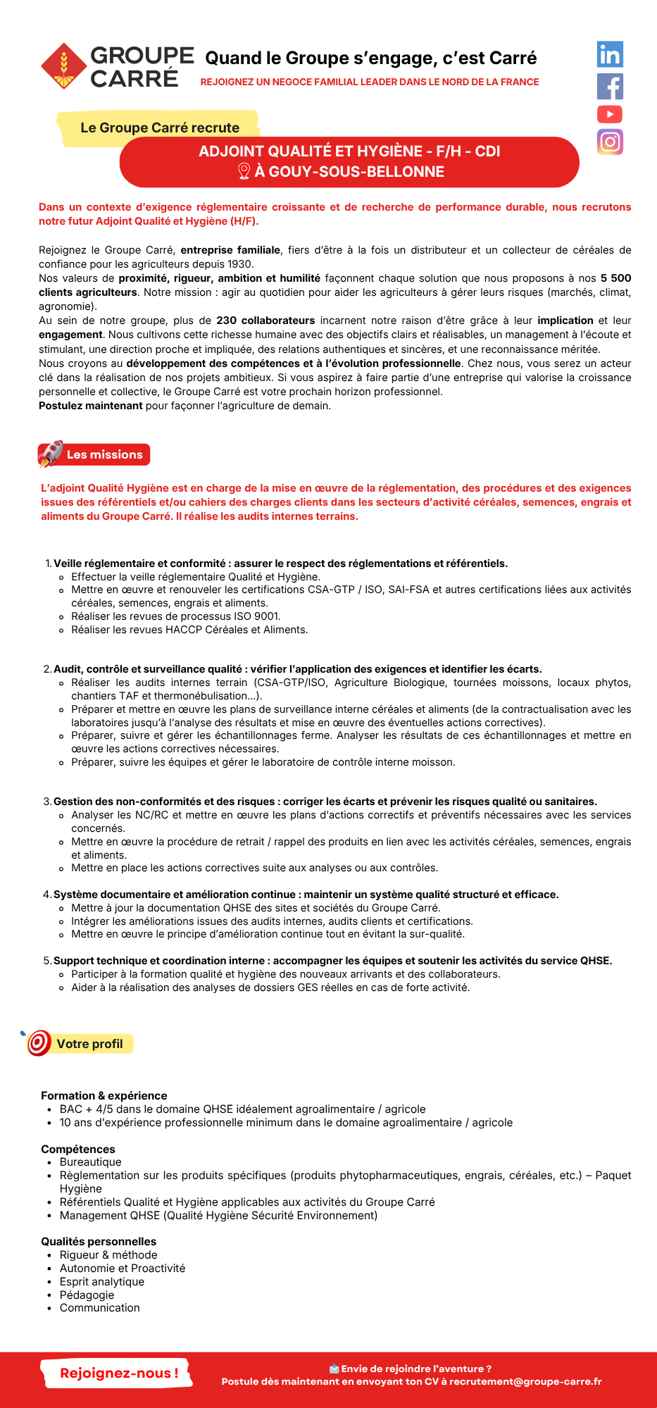 Dans un contexte d’exigence réglementaire croissante et de recherche de performance durable, nous recrutons notre futur Adjoint Qualité et Hygiène (H/F) basé à Gouy-sous-Bellonne, au siège du Groupe Carré.